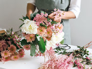 Start with greenery to give your arrangement structure and shape. Think eucalyptus, ferns or even herbs. Then layer in your main blooms. Don’t be afraid to play with height and asymmetry - place taller stems toward the centre and let smaller ones drape naturally around the edges. The result should feel effortless and organic, not overly styled.